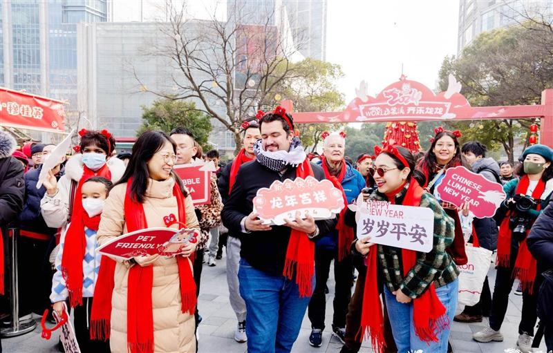 昨日,一条栩栩如生、气势恢宏的“龙头”在二泉广场亮相,吸引市民纷纷驻足拍照打卡。与此同时,围炉煮茶、年货美食、新春送福、戏服换装等充满中国传统年味的活动在二泉广场依次排开,吸引年轻游客沉浸式感受传统文化的魅力。“龙腾梁溪”用传统龙头烘托新春氛围,现场教学舞龙技艺,再现唐人街热闹;“龙年有戏”提供戏服及妆容体验,邀请锡剧老师现场教学,让外籍友人感受非遗戏剧的魅力;围炉煮茶以竹艺与红布打造美陈氛围,让外籍友人感受中国流传千年的茶文化;朱顺兴、穆桂英等老字号商家为市民带来了丰富的年货好礼;来自梁溪区的书法爱好者现场泼墨,用精美的书法作品为市民送上龙年祝福;萌宠主理人还为萌宠穿新装和现场的来宾进行互动,丰富的现场体验让嘉宾们感受到无锡“城里厢”的浓浓年俗氛围。
