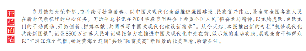 2023年常州地区生产总值破万亿,成为江苏第五座“万亿之城”,我省“万亿之城”总数由此约占全国的1/5、超出长三角一半。这是我省经济发展的又一里程碑,是我省以“走在前、做示范”的果敢担当、奋力推进中国式现代化江苏新实践的又一成果,体现了江苏坚持实体为先、创新为要、城市群协同发展核心理念,肩负起勇挑大梁、引领高质量发展的重任。本报记者近日奔赴各相关城市,就江苏“万亿城市群”的历史成因、动力路径以及城市现代化的实践探索进行专题调研。