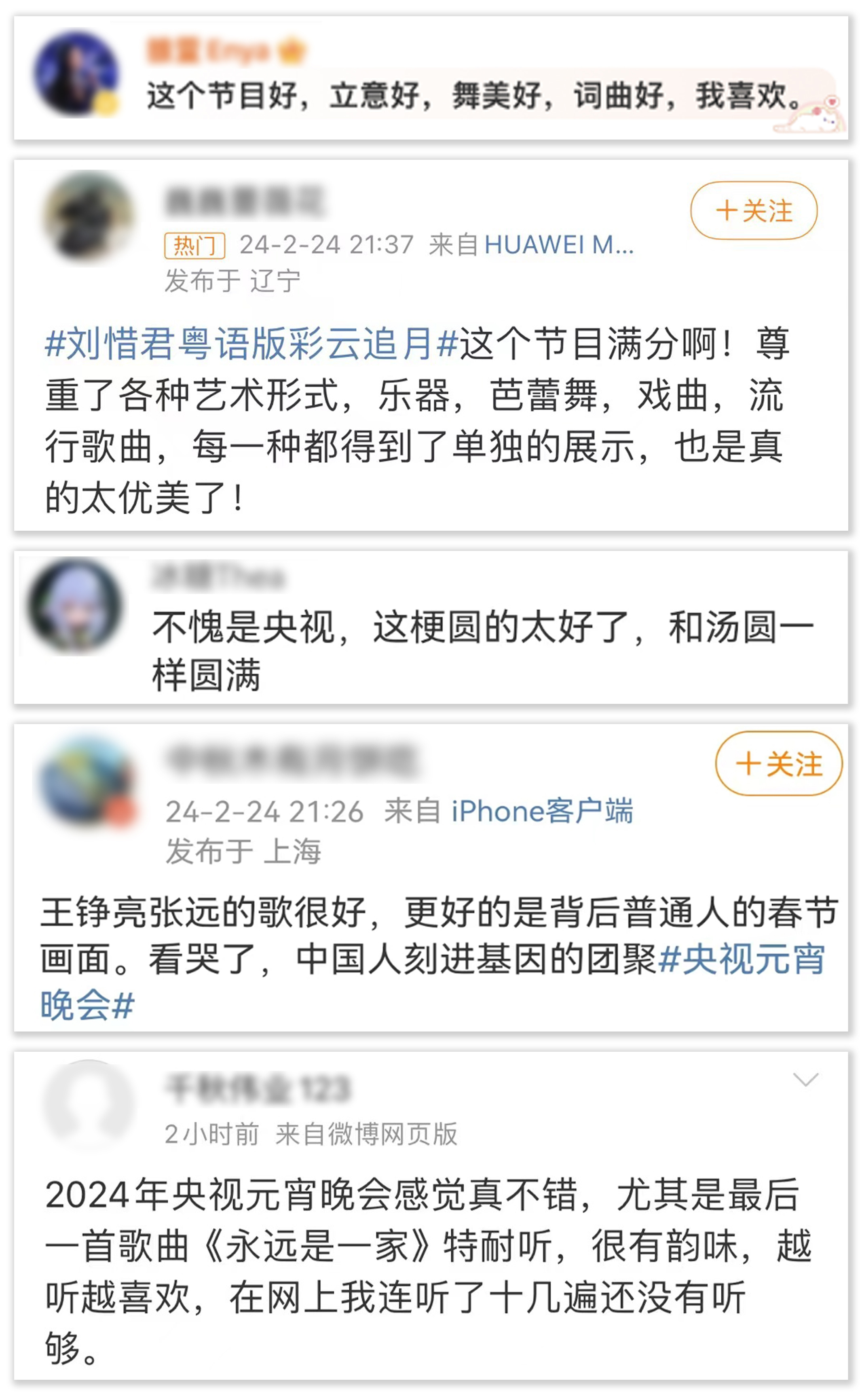 据统计,截至2月25日8时,总台元宵晚会跨媒体直播总触达人次3.53亿次,新媒体端直播播放量1.84亿次,电视端观众收看人次1.69亿次,均高于去年。元宵晚会在社交媒体的相关话题阅读量达29.9亿,贡献全网140个热搜话题,相关视频在新媒体端的点播播放量超2.5亿次。网友纷纷表示,“惊喜合体太懂我,元宵夜圆满了”“立意好、舞美好、词曲好”“共情的眼泪止不住”“国乐民乐、国风盛宴”。