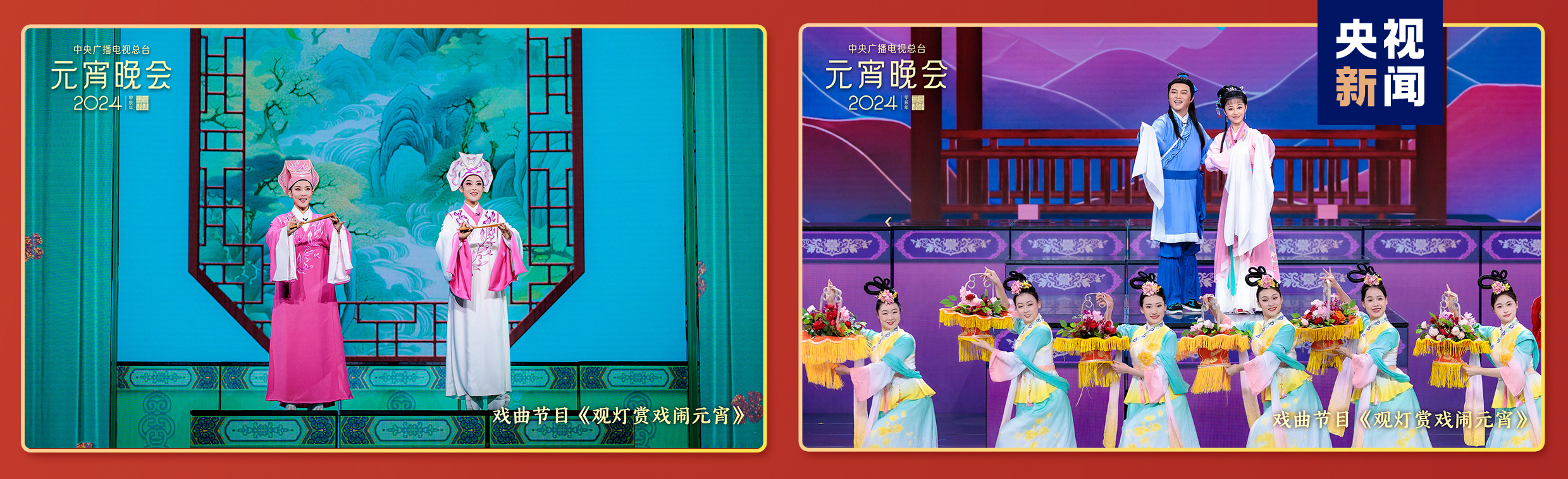 戏曲节目中,伴随着“火树千春妍,元夕月正圆,欢歌笑语喧”的戏腔戏韵,闽剧戏歌首次亮相总台元宵晚会。其他剧种还玩上了跨界表演,熟悉的旋律响起,站在舞台上的表演者却是令人直呼意外的“混搭”组合。陈丽君与黄龄携手带来越剧《梁祝》选段,潘柠静与沙溢共唱黄梅戏《天仙配》,在上元之夜演绎传世爱情故事,“戏曲真的出圈了”“谁说年轻人不听戏,永远为经典唱段打call”。