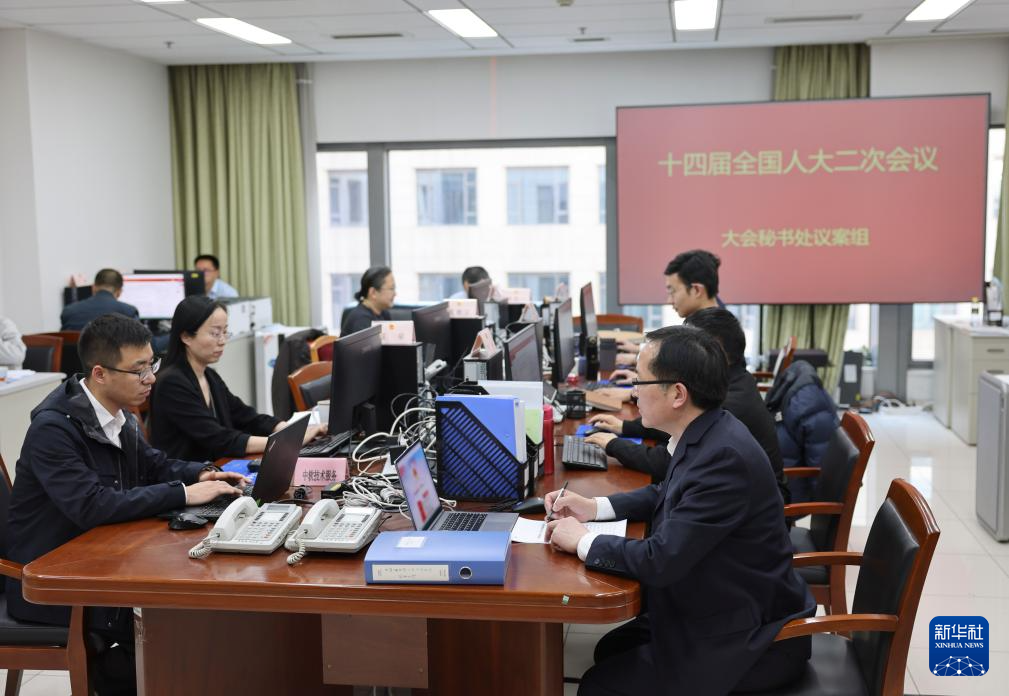 3月9日,十四届全国人大二次会议秘书处工作人员在认真工作。新华社记者 刘续 摄