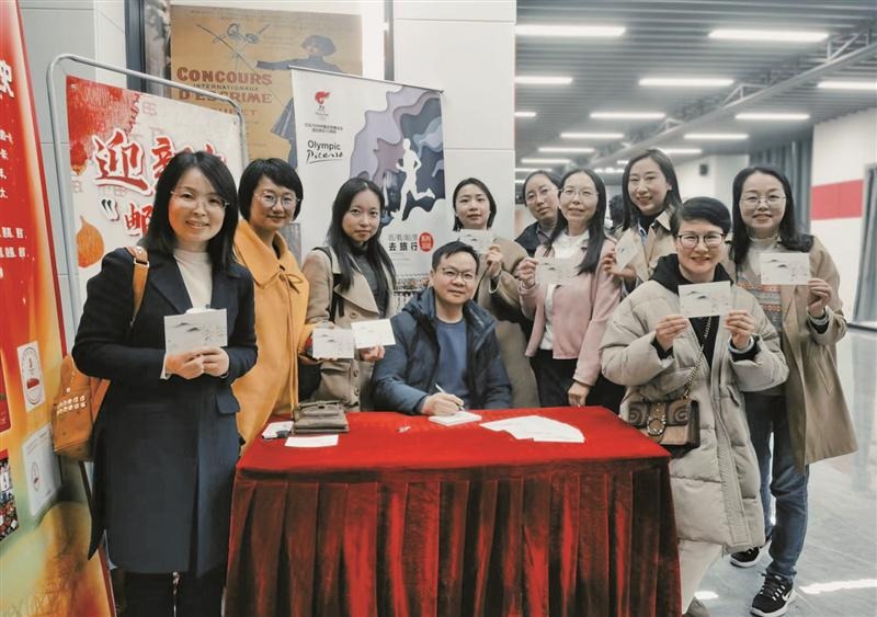 锡马十周年纪念明信片昨天在无锡市何振梁与奥林匹克陈列馆首发。图为明信片画面作者之一顾健新在首发式上签名。