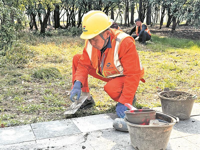 跑马拉松,赛事路段的道路品质很重要。随着“嗡嗡嗡”的机器声,行驶在环湖路沿线,不时有市政工人的身影出现,他们正在对排查出的问题进行处理。当一位工人操作着切割机器将拱起的道板分离开,另一位就赶紧整平地面泥沙,重新铺设上砖块……很快道板拱起的问题被顺利消除,变得平坦又干净。