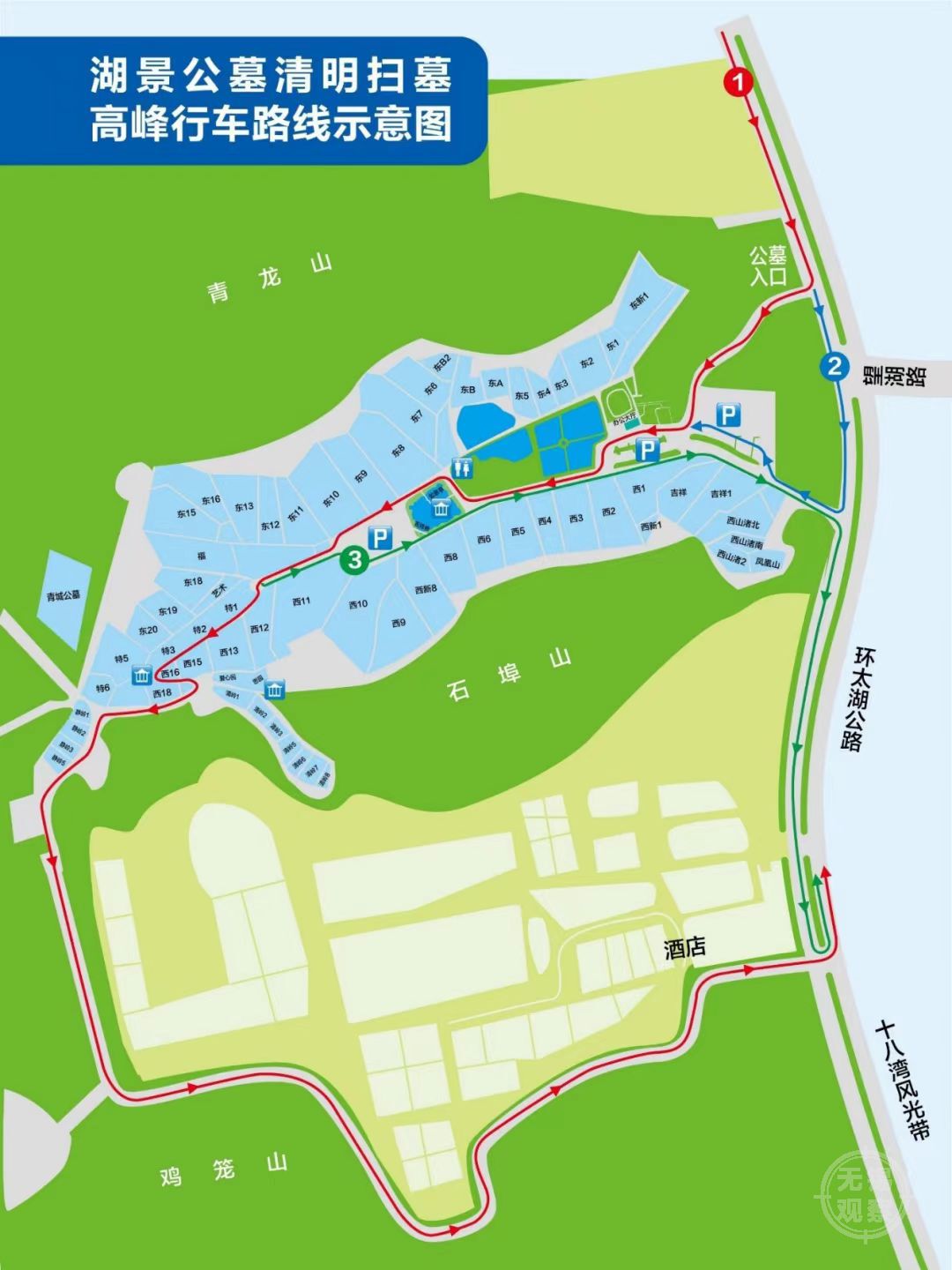 前几天,到湖景公墓祭扫的胡女士在保安的指引下,发现另一个“新”出口。为了分流祭扫车辆,湖景公墓设置了出入口各两个,两个入口均在环太湖公路,相距约300米;出口一个位于公墓牌楼入口处,另一个出口则在距离入口1000米左右的后山,也就是胡女士这次发现的“新”出口。