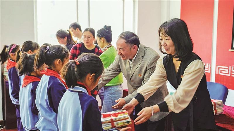 4月22日,梁溪区扬名街道五星社区开展“凝聚侨力量 同心沐书香”主题活动,人大代表、新的社会阶层人士、少数民族学生等40余人围绕“阅读使我快乐”“传承良好家风”等主题,开展了推荐好书、分享阅读感悟等活动。图为党员志愿者向少数民族学生赠送书籍。(邹振丰 摄)