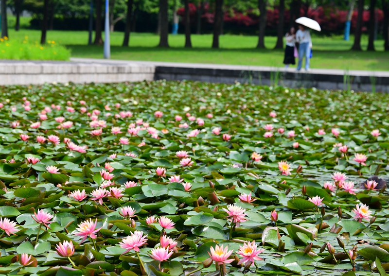 5月6日,市民在尚贤湖畔观赏池中的睡莲。眼下,锡城的睡莲开放,成为初夏一道美景。(还月亮 摄)