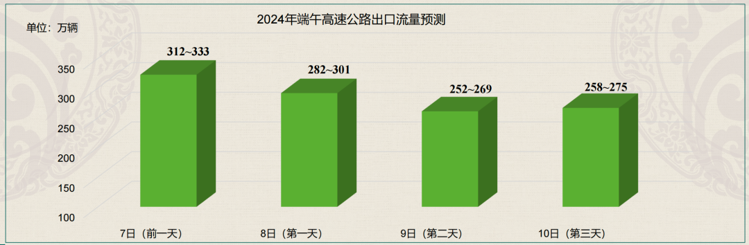 6月8日(假日第一天)、6月10日(端午节)高速公路收费站早晚“双峰”流量预计较平日高约30%,早高峰8:00—12:00,大中型城市周边收费站入口易拥挤;晚高峰16:00—20:00,城市周边收费站出口易拥挤。