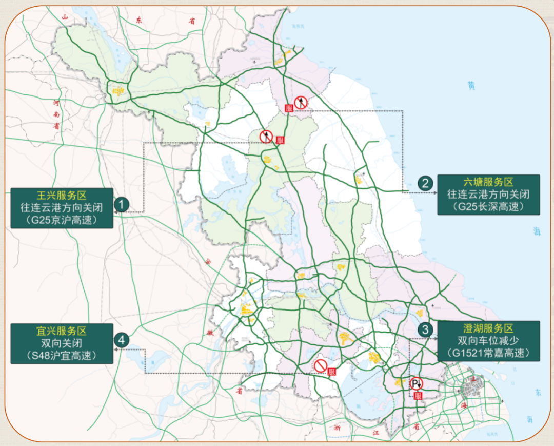 端午期间,G25长深高速、S48锡宜高速等高速公路沿线共有4个服务区有车位减少、服务区关闭等特情,请注意!