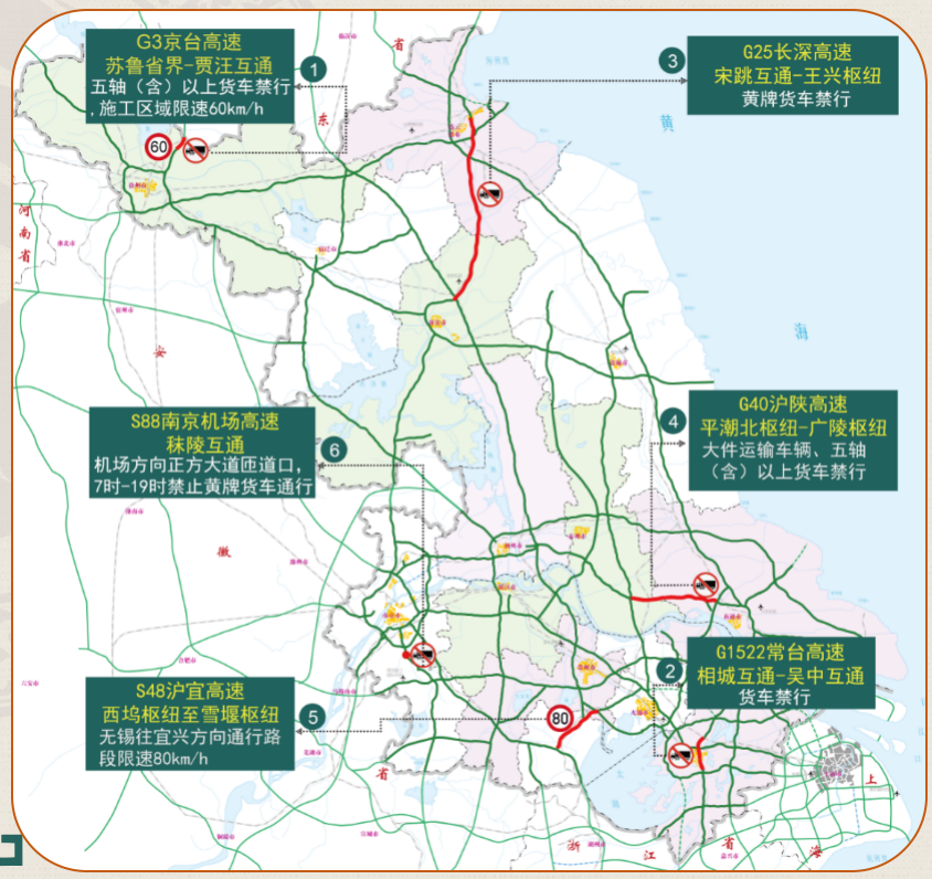 端午期间,江苏高速对危化品运输车全路网全时段禁行。另外,部分重要路段、节点实施交通管控政策,相关车辆假日期间提前绕行,请勿驶入限行路段。