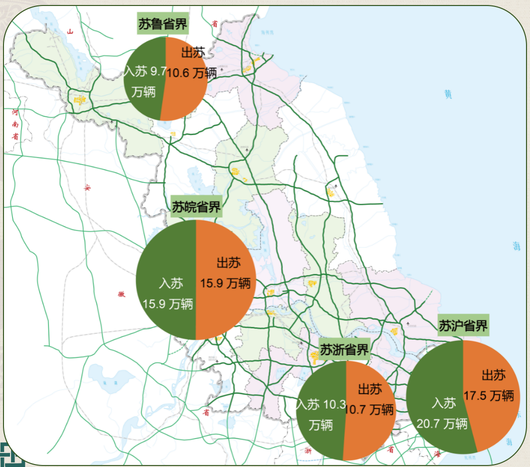 端午期间,跨省、跨区域长距离出行比例较平日明显增加,预计我省高速公路省界通道流量较去年增长明显,出入我省高速公路省界路段流量约为111.3万辆,较平日增长10%左右。因节日期间进出上海、安徽的车辆较多,周边相邻四省(市)中,苏沪省界、苏皖省界,日均交通量分别约为38.2万辆、31.8万辆。