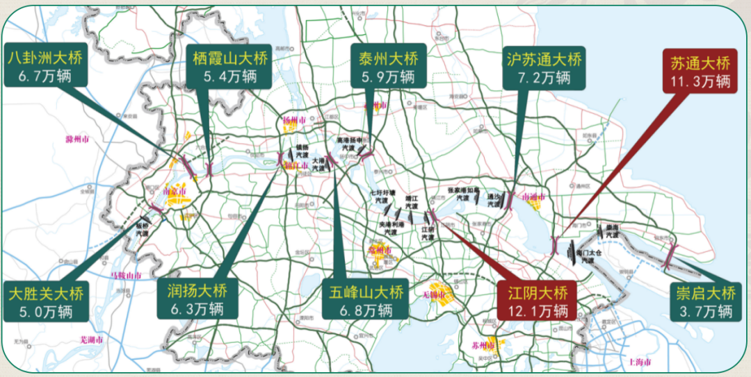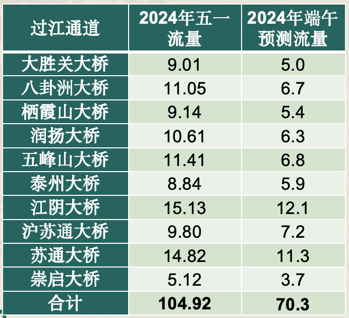 全省10座高速公路过江通道端午假期首日早高峰通行压力较大,日均过江流量预计为70.3万辆,较平日增长约20%,较五一流量低约30%。随着五峰山大桥、燕子矶过江隧道的通车运营,过江通道流量分布更加均衡,但江阴大桥、苏通大桥交通流量依然较大。