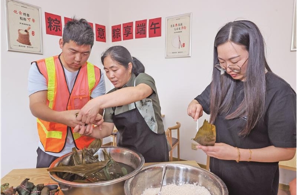 非遗体验添活力。今年端午假期适逢高考,阳山的传统美食铺子如意村推出“一举糕粽”礼盒,国潮风竹篮搭配传统美食安阳糕和粽子,款式新颖又应景,吸引了众多购买者。“安阳糕是阳山的特色糕点,搭配上端午必吃的粽子,礼盒寓意好,也代表了对广大考生的祝愿。”如意村负责人说。除了吃粽子,戴五彩绳也是端午必不可少的一项内容,在桃文化创客中心,游客们在师傅的指导下编织桃雕五彩绳,非遗桃雕搭配粽子香包编成手绳,在体验手作乐趣的同时感受传统文化的魅力。