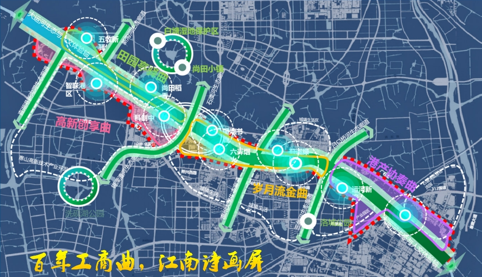 运河之脉,牵动水、岸、城等空间要素。“乡镇工业发达的惠山,多年来沿运河集聚了大量企业和居住区,规划拆迁面积达52.27万平方米,目前已累计完成拆除50.12万平方米,完成率达95.8%。”尤维锋说,整治工程以运河为纽带,“缝合”各个区段功能体系,打造大运河生态与文化体验轴。按照最新出炉的整治工程规划,全流程打造“高新创享曲、田园亭驿曲、岁月流金曲、港产协奏曲”4大功能区段,以运河干流为“树干”,主要旁支水系及道路成为“树枝”,规划建设“直湖港、新沟河、锡溧漕河”等5条生态与景观廊道,使城与水相融,同时,根据文化遗存情况,沿运河打造“五牧驿站、尚田稻香、智联港区、科创中心、墨池书香、六弄烟火、葑溪绿脉、活力走廊、运河新埠、高桥大港”十大特色场景画屏,全方位展现运河百态。