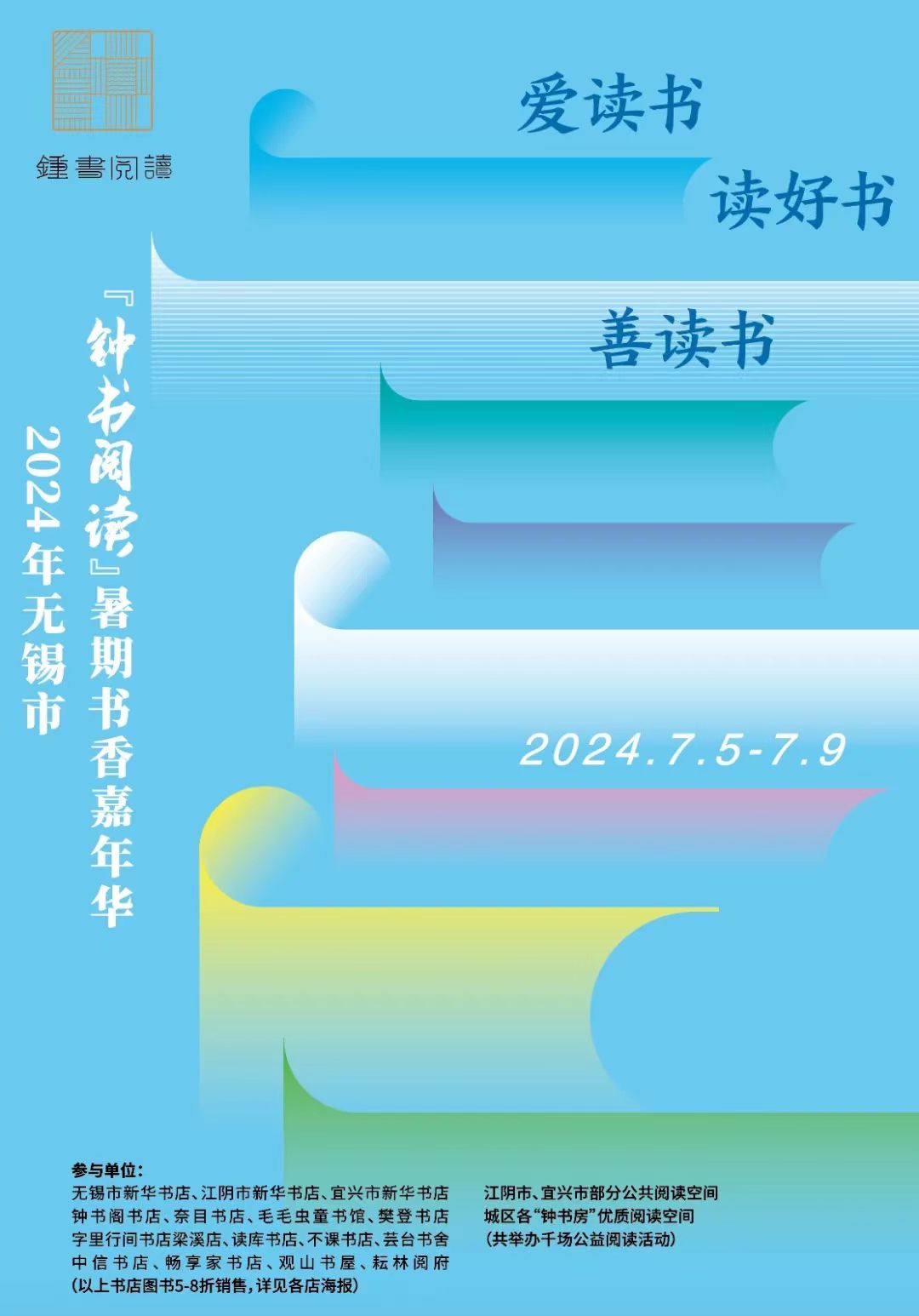 值得一提的是,今年的“钟书阅读”暑期书香嘉年华,得到了全市15家实体书店的支持,数量创历年之最。5日至9日,无锡、江阴、宜兴新华书店全场图书7至8折,其它民营书店全场图书5折。同时,全市各“钟书房”,以及江阴、宜兴的优质公共阅读阵地都将举办阅读推广活动,共计1200场项,其中,重点、特色活动150场,覆盖面广,内容丰富,邀请市民朋友共享“书香大礼包”。
