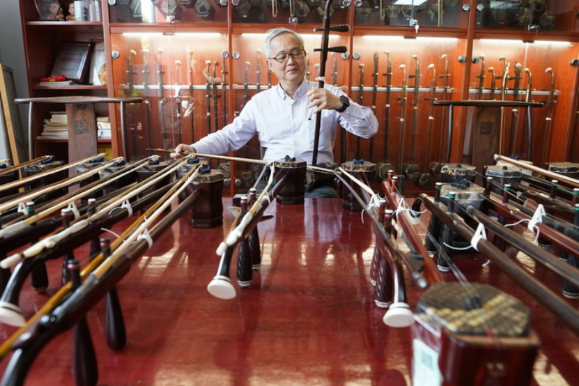 2023年3月28日,在江苏无锡梅村街道二胡产业园古月琴坊车间,来自香港的乐器经销商李开在试琴。新华社记者 季春鹏 摄