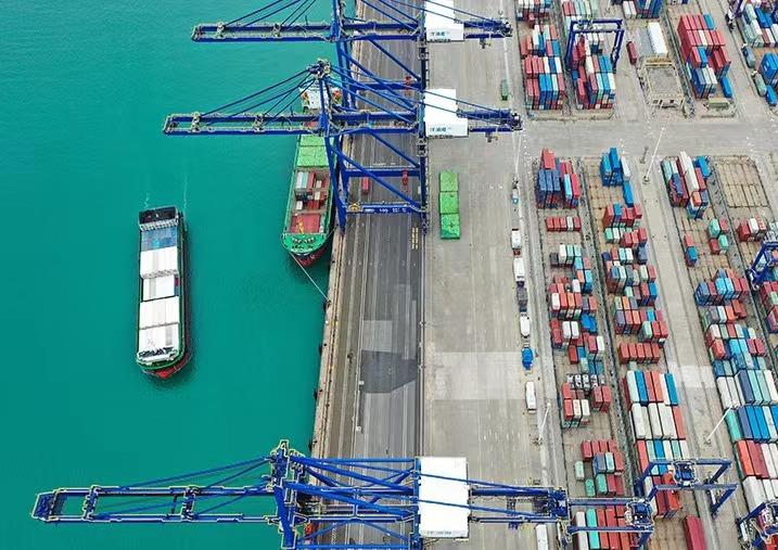 △集装箱货轮在海南洋浦国际集装箱码头装卸货物。