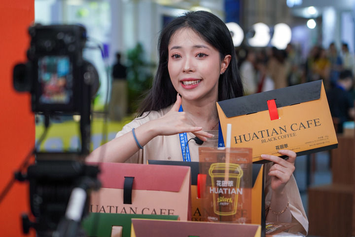 2024年7月24日,参展商在南博会咖啡产业馆直播带货。新华社记者 王静颐 摄