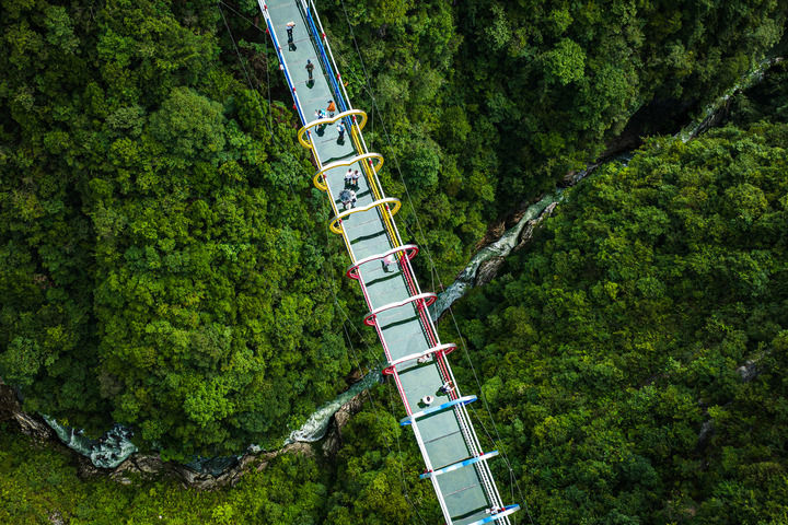 2023年8月20日,游客在湖北省恩施州建始县地心谷景区游玩(无人机照片)。新华社记者 肖艺九 摄