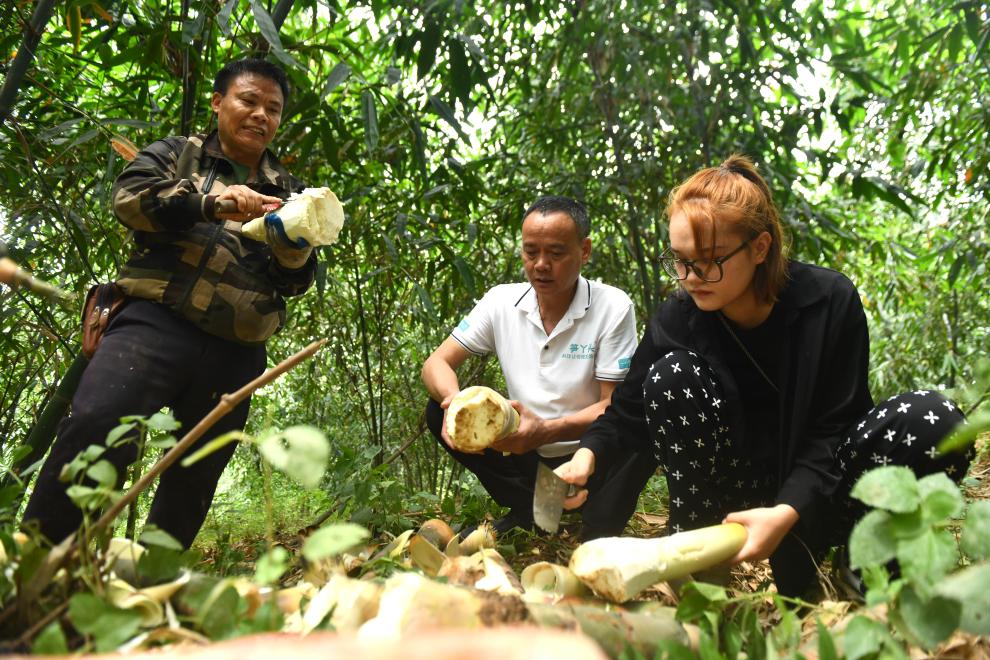颜茜茜(右)和父亲颜建条(中)在竹笋种植基地采收竹笋(2024年7月23日摄)。29岁的颜茜茜是广西柳州市柳江区三都镇白见村的一名返乡创业青年。2021年,大学毕业后在机场工作了五年的她,决定辞职回到家乡创业。新华社记者 黄孝邦 摄