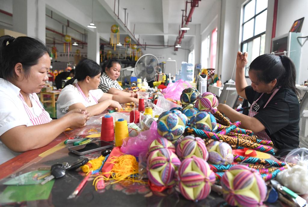 工人在广西靖西市绣蕴坊绣球文化有限公司制作绣球灯(2023年8月2日摄)。靖西市新靖镇旧州村基本每家每户都有人会制作绣球,年产绣球约50万个。对于当地人来说,绣球不仅代表古老的手工艺,更是增收致富的手段,让农村妇女能够就近就业和居家灵活就业。新华社记者 周华 摄