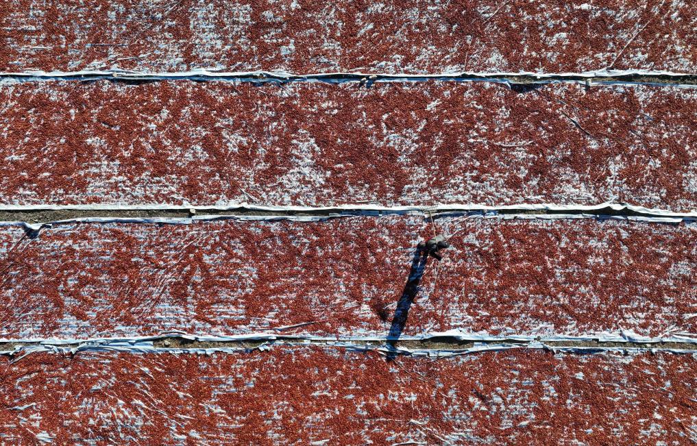 河北省遵化市侯家寨镇的农民在晾晒用于中药材的山楂片(2023年11月14日摄,无人机照片)。近年来,河北省遵化市在推进山地生态修复和产业富民过程中,引导农民在荒山坡上种植山楂树,为种植户带来良好收益的同时,实现荒山披绿。新华社记者 杨世尧 摄