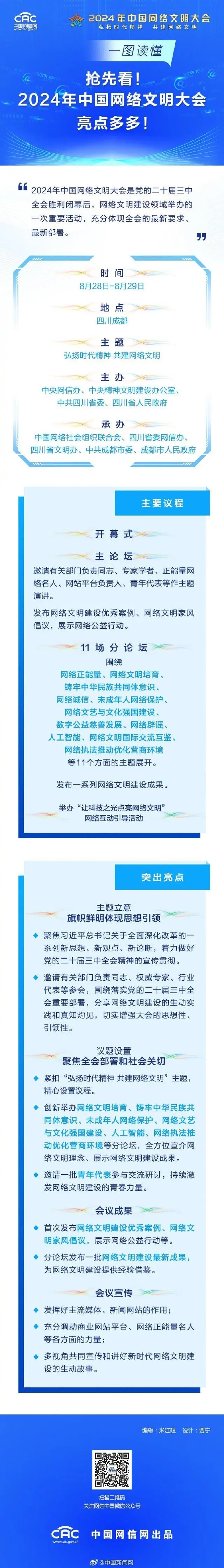 2024年中国网络文明大会将于8月28日至29日在四川成都举办。本次大会以“弘扬时代精神 共建网络文明”为主题,由中央网信办、中央精神文明建设办公室、中共四川省委、四川省人民政府共同主办,中国网络社会组织联合会、四川省委网信办、四川省文明办、中共成都市委、成都市人民政府联合承办。大会将举办开幕式及主论坛、11场分论坛和“让科技之光点亮网络文明”网络互动引导活动。