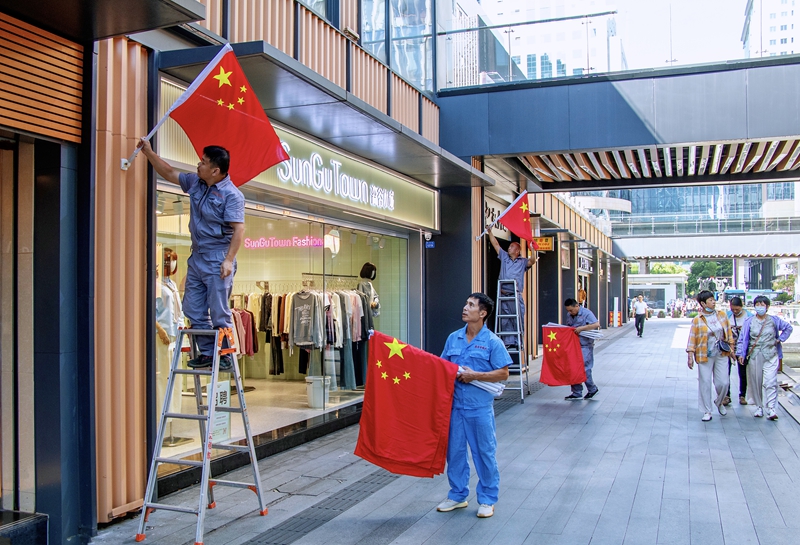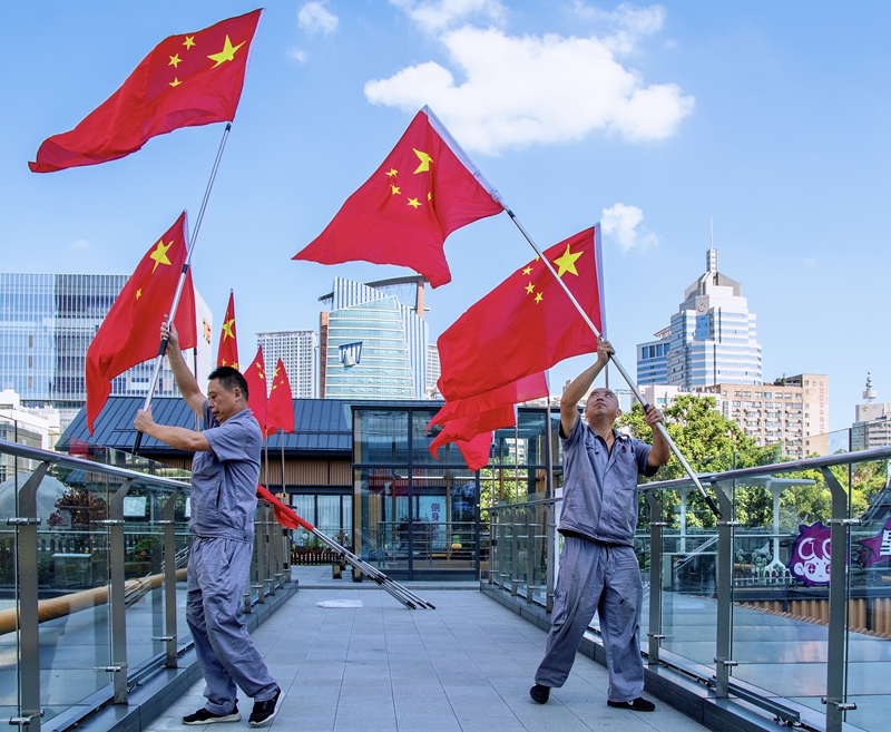 为迎接“十一”国庆节,23日崇安寺内已开始营造节日氛围。在蓝天白云的映衬下,飘扬的五星红旗显得格外耀眼。(李一芳 摄)