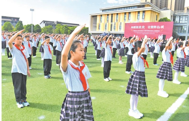 9月27日上午,在无锡市育英文旅实验小学,伴随着慷慨激昂的国歌,鲜艳的五星红旗冉冉升起,少先队员行队礼,齐唱国歌。
