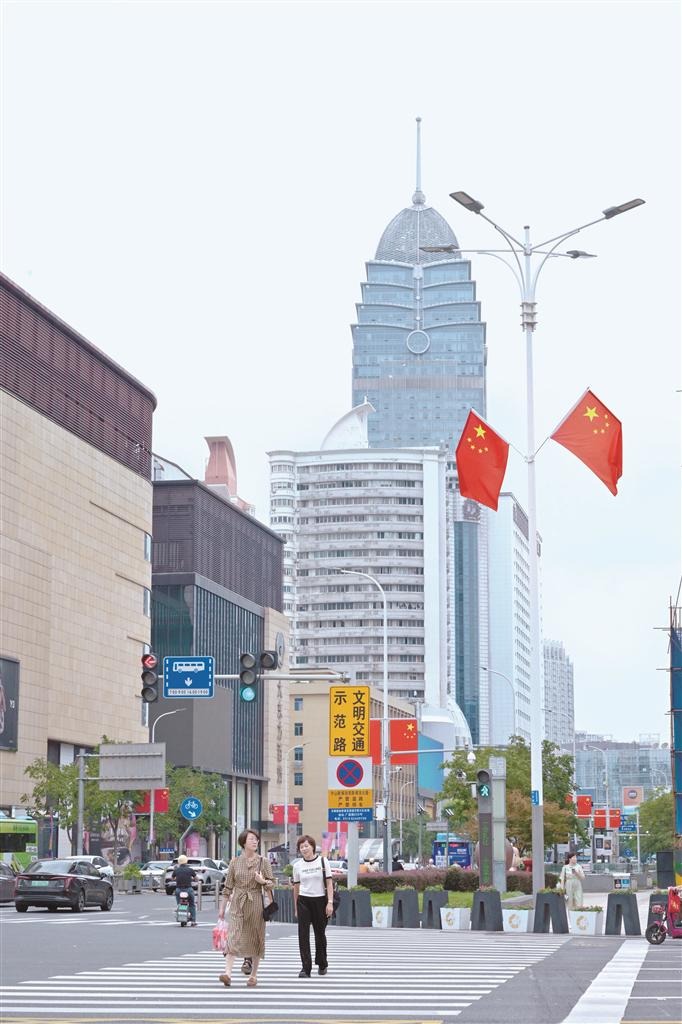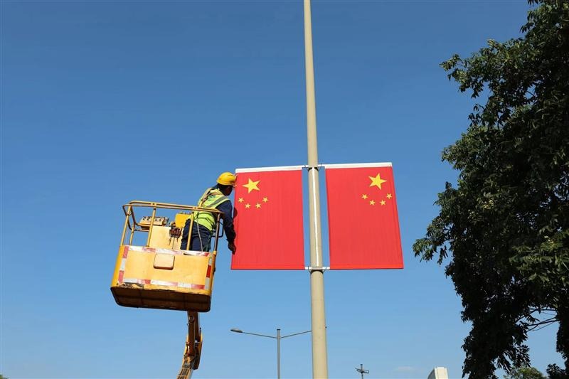 城市中心重点道路中山路两旁,五星红旗挂上道路灯杆,引得众多市民驻足拍照。“坚持‘朴素过节’的原则,悬挂五星红旗的不锈钢抱箍均可重复利用,在市管路段采用‘一隔一’的悬挂国旗方式,保证节庆氛围的同时大大降低了成本。”无锡照明股份有限公司运营维护公司项目经理周晓东介绍,太湖大道(塘南路—五湖大道)、贡湖大道(解放环路—周新路)、中山路(朝阳广场—胜利门)、人民路(解放西路—解放东路)以及解放环路沿线共计悬挂558幅国旗,这5条城市主干道将成为市民和游客感受节日氛围的重要点位。“祝福祖国,爱我中华!”“热烈庆祝中华人民共和国成立75周年!”国庆期间,我市各地的电子屏还将统一播放国庆祝福语,表达对共和国的美好祝愿。