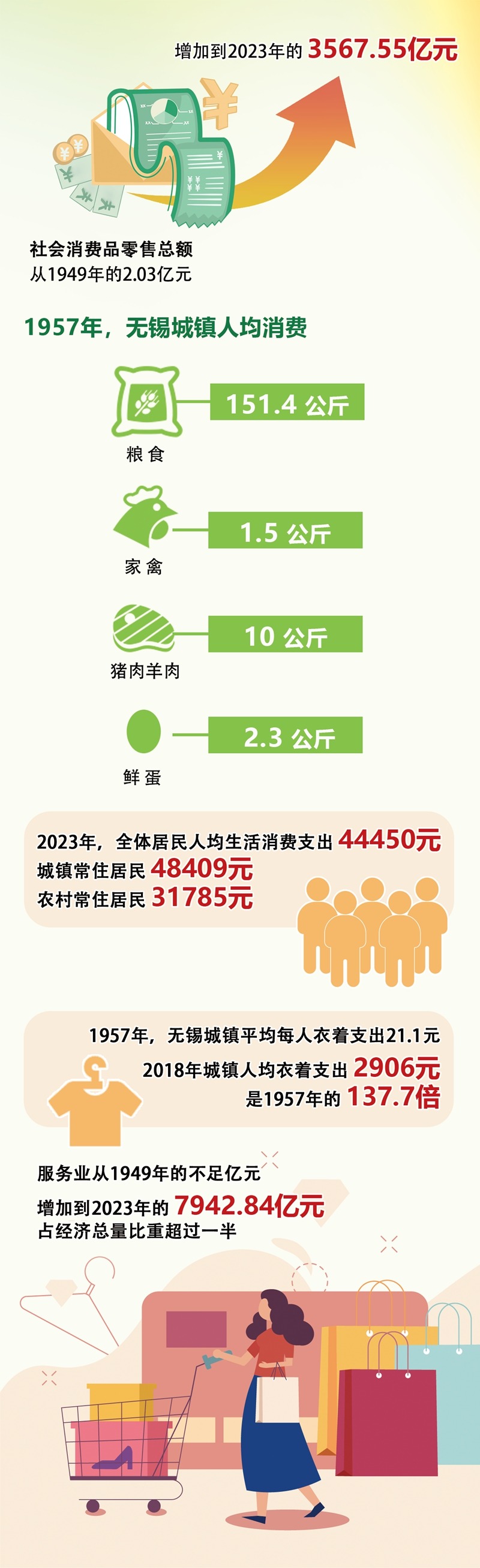 与此同时,河埒口商圈、太湖新城商圈、锡东新城商圈悄然崛起,无锡商圈从只有一条中山路到呈“十”字分布。统计数字也为此添加了注脚:全市社会消费品零售总额从1949年的2.03亿元增加到2023年的3567.55亿元,批发业销售额达到29562.63亿元,零售业销售额达到2921.19亿元。