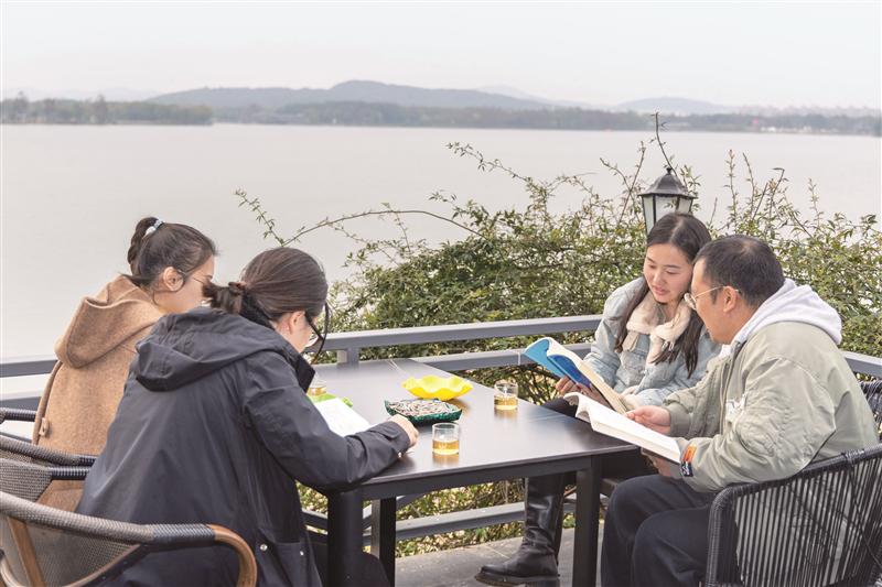 蠡湖街道“渔阅书吧·钟书房”为辖区居民和游客提供了冬日休闲新去处。欣赏蠡湖美景的同时,人们可以走进“钟书房”,在冬日阳光下享受阅读的乐趣。这里不仅是一个阅读空间,更是一个文化交流的平台。图为昨日,市民在“渔阅书吧·钟书房”品茶看书。(敖翔 摄)