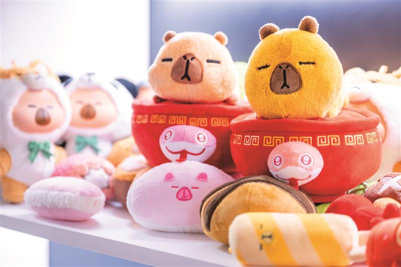 一走进拍信科技,记者就被展架上的联名公仔“春碗”吸引了:圆滚滚的小黄豚,慵懒地趴在一个红色的大碗上,碗身饰有传统回文图案以及蛇年元素。除此之外,该系列还有好柿花生组合毛绒公仔、红包啪啪圈、冰糖葫芦毛绒挂件等。