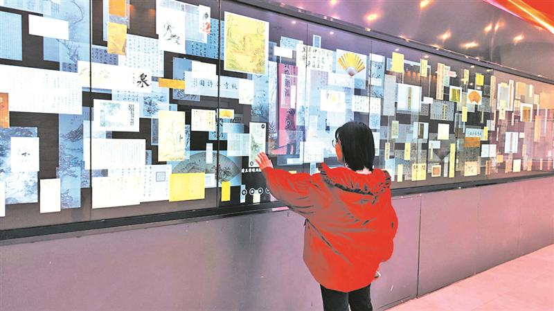 随后,黄女士在服务台租了一副AR眼镜,“实物与视频讲解相结合,比走马观花强太多了。”在西区负一楼的“高山仰止书法艺术展”展厅中,一处立轴式的光影装置通过数字技术,将人们带入一个水墨光影的世界,其中还隐藏了几个互动“彩蛋”,令观展者沉浸式感受到了书法艺术的灵动之美。