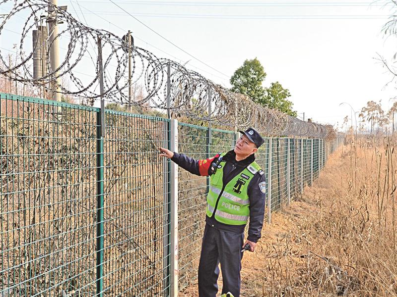 “这是专门供铁路施工作业人员使用的通道,必须保持常锁闭的状态,防止非作业人员进入铁路。”老沈检查发现锁扣正常,但有一两段水泥护栏因长期“服役”出现裂缝,他记下这处隐患,报给铁路工务段检修。