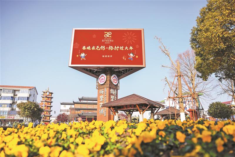 此外,无锡高新区各大交通要道的巨大电子屏幕滚动播放着2025年中央广播电视总台春节联欢晚会无锡分会场的吉祥物“乙长福”和“巳有禧”。该区各大商圈也纷纷在店铺显示屏上展示春晚元素,营造出浓郁的节日气氛。公交车站的广告牌、电子屏也换上了喜庆的红色“新装”。梅村街道的“春晚在无锡·梅村过大年”春晚主题公交车在城市中穿梭,成了街头一道流动的风景线。