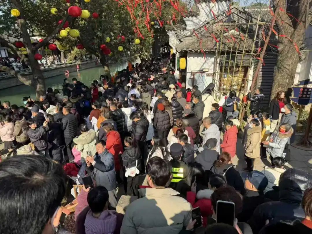 年初一上午十点,春晚无锡分会场的取景地之一惠山古镇已经迎来浩浩荡荡的游客“大军”。桥上、岸边、窄巷中,一眼望去人头攒动,来自工作人员“此处拥堵,请勿停留”的提醒成了游览的背景音。