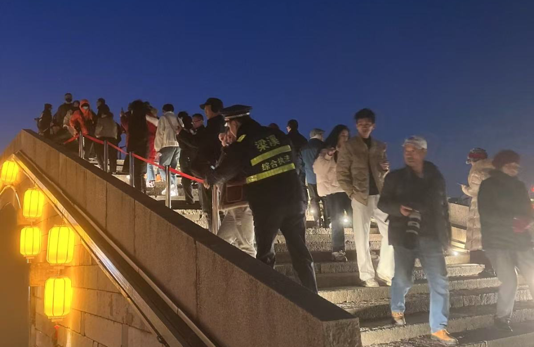 惠山城管中队指导员秦旭锋主动对接古镇管理方,把工作范围向景区内延伸。一位阿姨带着小孙子看夜景,却害怕走高高的石拱桥,秦旭锋见状主动接过小孩抱到桥下。“晚上风景特别好看,有的人喜欢在桥上拍照,也有人带着小孩坐在沿河护栏上休息,我们在桥上、沿河和临水的地方都安排了城管队员。”他说。