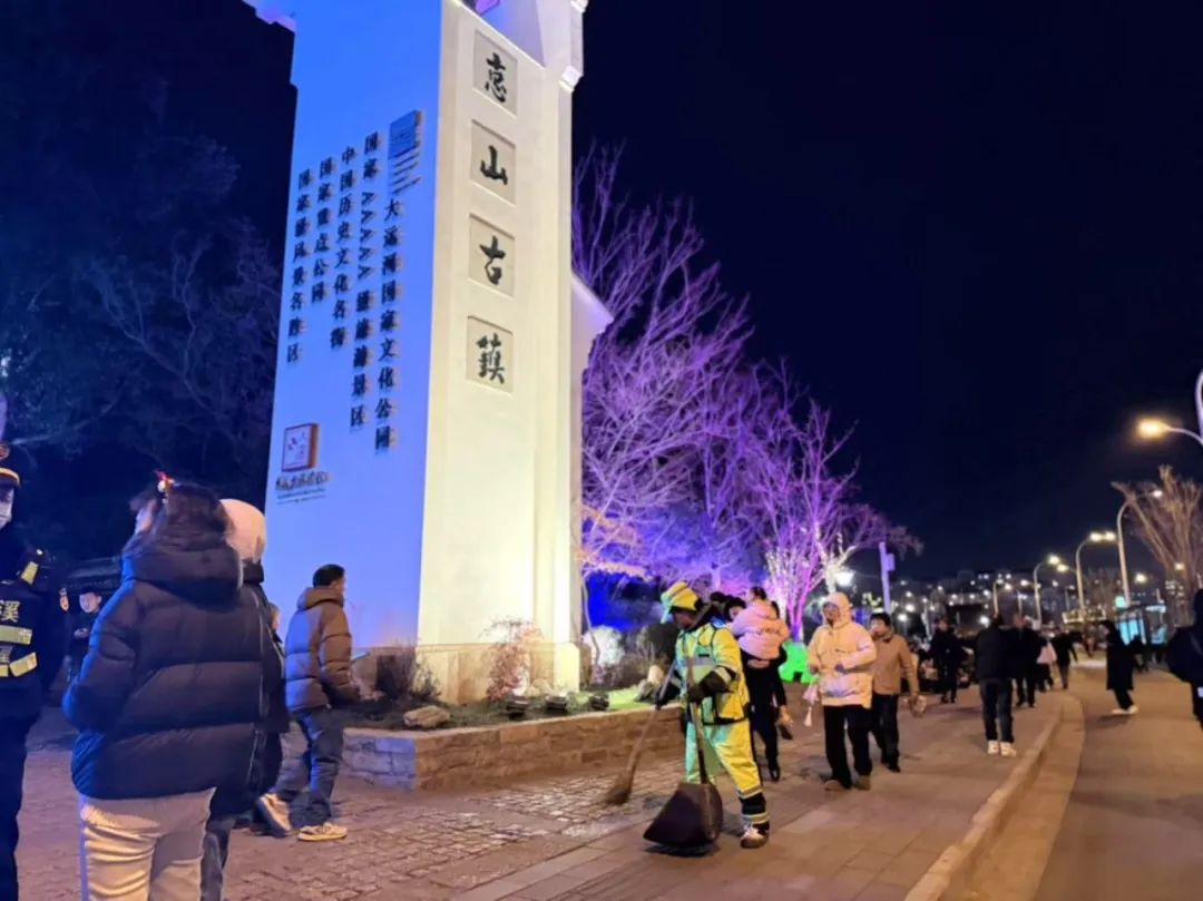 惠山城管中队从古华山路地铁口至西神广场区间,每30米设一名队员全天值守,清理共享单车,劝离无证摊贩,及时疏导交通。夜间,梁溪区城管局还派出特勤中队和北大街中队增援惠山古镇。队员们在上河塘、下河塘以及每座桥上值守,提醒游客不要拥挤,谨防落水。游客们问得最多的问题是“春晚分会场舞台在哪里”,城管队员一一解答,还不时为大家拍照留念。