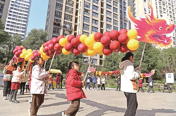 2月10日,在新吴区旺庄街道尚泽社区,老少居民在迎元宵活动上进行舞龙表演。(还月亮 摄)
