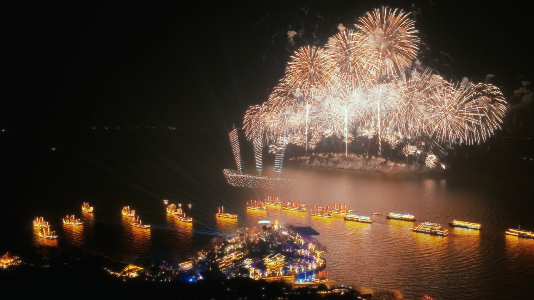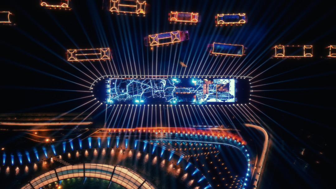 河道船只交会往来,岸边市集上惠山泥人、无锡精微绣、宜兴紫砂等无锡非遗琳琅满目,小笼包、银丝面、乌米饭香气扑鼻……光影变化间,再现了无锡“米码头”“布码头”“丝码头”的漕运盛景。这种以水为媒的叙事,不仅是对“水韵江苏”的完美诠释,更是对运河文明活态传承的当代演绎。