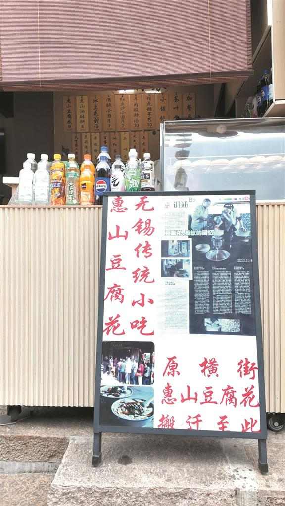 走进惠山古镇的小吃街,在一连串“旋风大土豆”“竹筒冰淇淋”的摊位中,门口放着“原横街惠山豆腐花搬迁至此”标牌的豆腐花店分外醒目。标牌上还贴着《江南晚报》2010年做的专访报道,但这并非小店最初的样子。