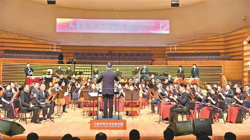 从激昂奋进的《光明行》,到婉转深情的《春江花月夜》;从江南丝竹的细腻韵味,到大型民族管弦乐的恢宏气度,一系列经典与创新曲目展现出江阴民乐的深厚底蕴与时代风采。演出中,锡剧元素的融入成为一大亮点。江阴市锡剧评弹艺术传承中心优秀青年演员朱家怡、姜佳晨登台亮相。“借这个平台实现民乐与地方戏曲的融合发展。”江阴市刘天华民族乐团团长沈鸣华介绍。