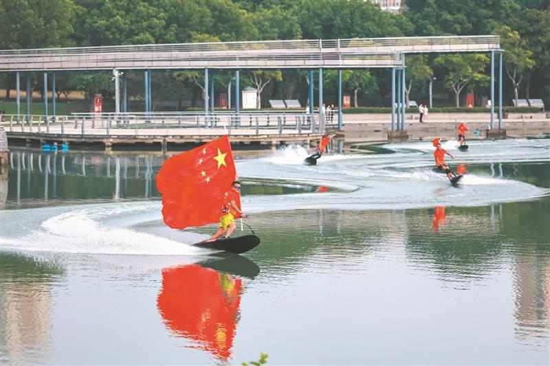 ⑥金城湾公园,水上运动爱好者手擎国旗在湖中劈波斩浪。