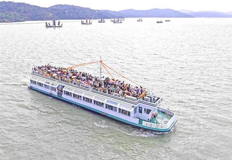 节日期间,游客在太湖鼋头渚景区乘船游览。(还月亮 摄)