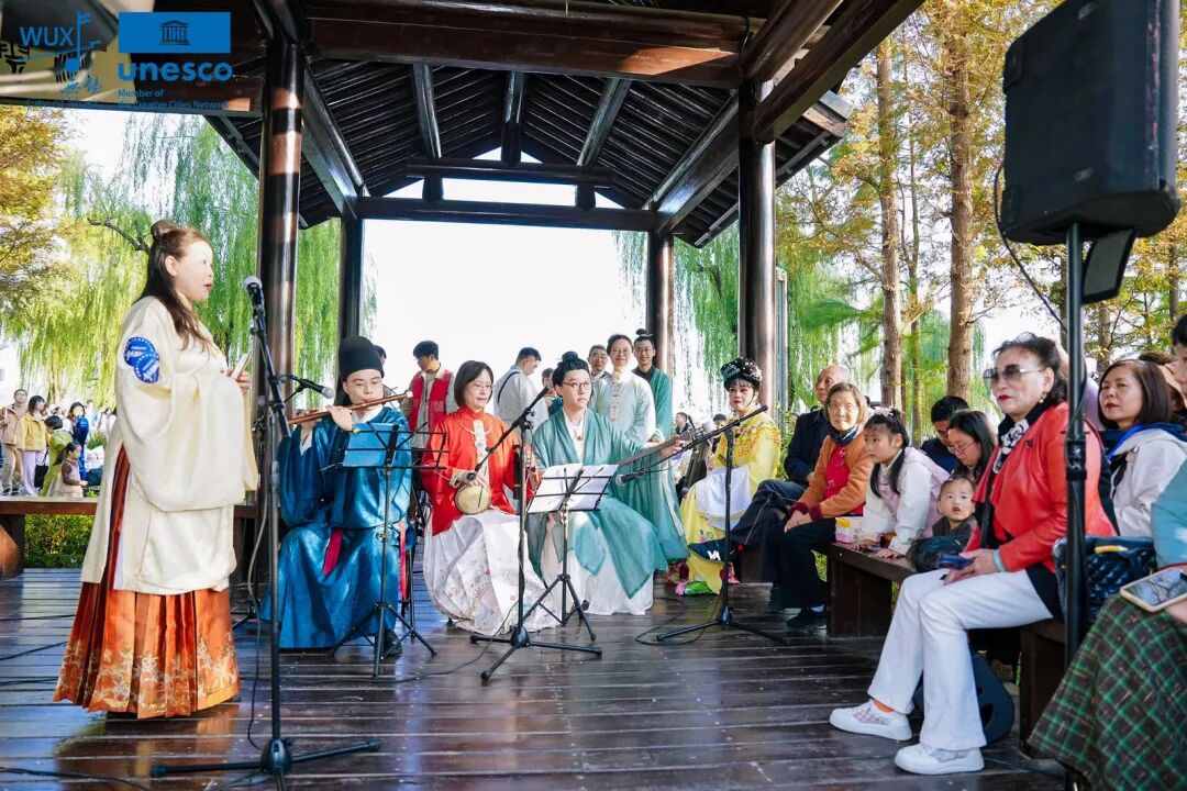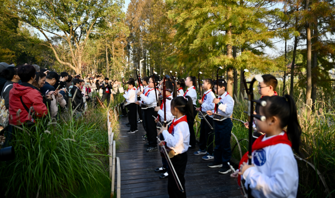 这是属于无锡人的音乐狂欢:流云轩的“千年雅韵”舞台上,无锡市锡剧院、天韵社与崇宁路实验小学、老年大学的传承者们同台,勾勒出一幅生动的非遗画卷。“400年前的《皂罗袍》今天还能唱响,也必须唱响,这是‘世界音乐之都’无锡的一份责任。”天韵社成员感叹道。湖边栈道的“民乐雅集”现场,史君超的洞箫《春有百花》刚落,葛强的埙声《烟雨》接续演奏。梅村实验小学“太湖情韵”二胡社团的孩子们个个精神饱满,演奏一气呵成,展现了新生代民乐力量。社团领奏老师纪海军告诉记者,无锡成了“世界音乐之都”,这对二胡琴童们是最好的激励,让他们知道了传统音乐也能被世界听见。