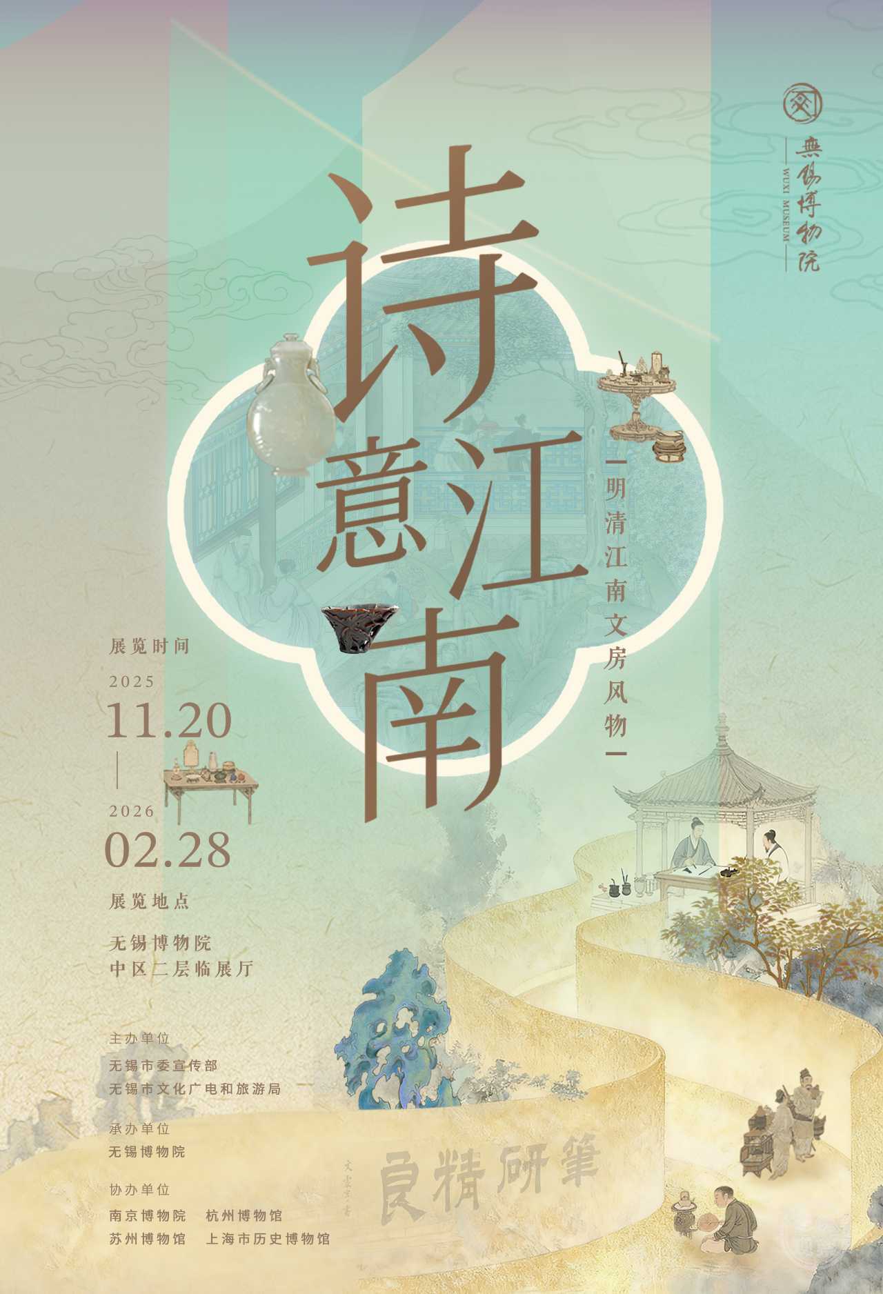 这是一场以无锡为代表的江南文化主题综合艺术展览。无锡博物院特遴选展出数十件古代文房书画精品,联合展出南京博物院、苏州博物馆、杭州博物馆、上海市历史博物馆等长三角文博机构藏品,分为笔砚精良、金石为友、茶酒斟酌、澄怀观物四个单元,呈现无锡独特的自然风貌、人文精神与艺术气韵,邀请广大观众走进明清江南文人的生活空间,领略江南风物之美。(张月)