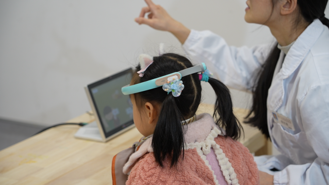 小华的康复之路曾充满阻碍。医院初级特教强珎薇回忆,传统康复训练中,小华最多只能坚持几分钟就会哭闹抗拒。今年11月,医院引入“开星果脑机接口社交沟通训练系统”后,她就为小华增加了这一康复内容。“这套系统能通过头环上的电极片,实时采集孩子的镜像神经μ波,再以动画、游戏的形式给出反馈。”