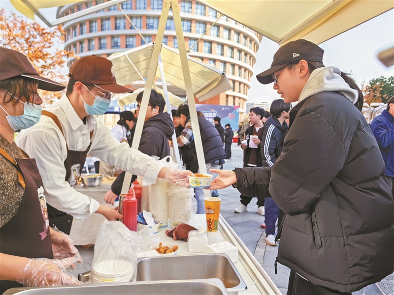 本次美食文化节向师生发放了3000多张餐券,学生凭券可以免费品尝在场的大多数美食。“虽然要排长队,但我们都是幸运儿!”两名在小酥肉展位前的队伍中耐心等待的女生介绍,每个班级都分到了一定数量的餐券并进行了抽奖,他们都中了奖。“为我们学校打call,希望学校多举办这类活动。”一名品尝着小酥肉的男生说。