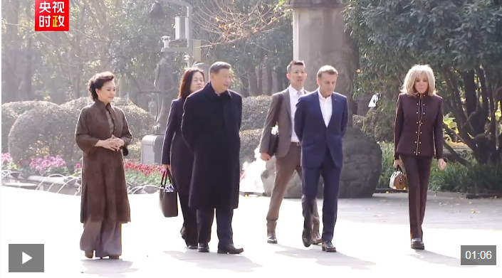 初冬的都江堰,苍山掩翠。马克龙夫妇抵达时,受到习近平和彭丽媛热情迎接。两国元首夫妇沿堰功道边走边谈。习近平介绍都江堰历史和意义,指出都江堰水利工程是全世界迄今唯一仍在使用的古代水利工程,也是人类与自然和谐共生最早的成功实践之一,修建过程充分反映了中华民族自强不息、不畏艰难、勇于开拓的精神。两国元首夫妇落座怀古亭,临水品茗,纵论天下。