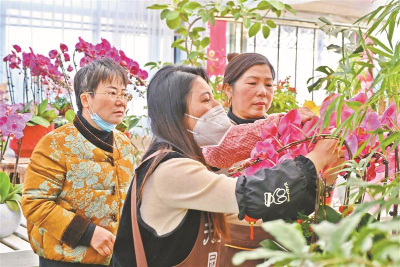 眼下,冬季花卉迎来销售旺季。近日,在锡山国家现代农业产业园蝴蝶兰生产基地大棚,双层棚膜将温度控制在20摄氏度,工作人员正在给花卉组盆,为节日市场做准备。(李一芳 摄)